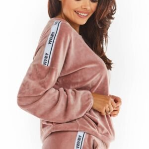Prosta bluza o luźnym kroju z marszczeniem przy rękawach. Wykonana z ciepłego i miękkiego weluru. Bluza ma zakładki z przodu i na rękawach. Ozdobna taśma lampasowa z logiem naszej marki na ramionach. Dostępna w 4 kolorach: beżowym, czarnym, bordowym i różowym. Produkt zaprojektowany i wyprodukowany w Polsce.