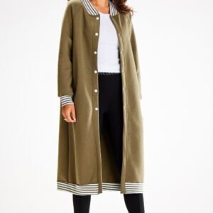 Długa, prosta bluza z ozdobnymi ściągaczami w paski, zapinana na białe napy. Po bokach kieszenie wsuwane.