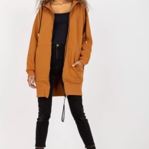 Bluza damska o przedłużonym kroju, z długim rękawem. Bluza z kapturem, zapinana na zamek. Po bokach kieszenie wsuwane.