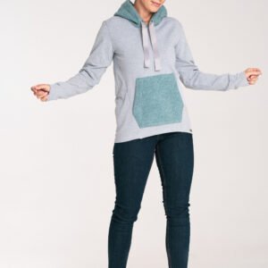 Bawełniana bluza z długim rękawem oraz luźnym kapturem z wełny. Z przodu naszyta kieszeń typu kangurka z wełny.