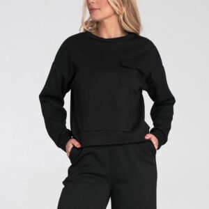 Bluza damska o prostym kroju, wykonana z miękkiej i komfortowej w noszeniu tkaniny. Model z długimi rękawami oraz klasycznym, okrągłym dekoltem. Ozdobna kieszeń z patką na piersi nadaje całości modnego, casualowego charakteru. Bluza wykończona elastycznym ściągaczem w pasie oraz przy mankietach, co zapewnia dobre dopasowanie i wygodę użytkowania na co dzień.