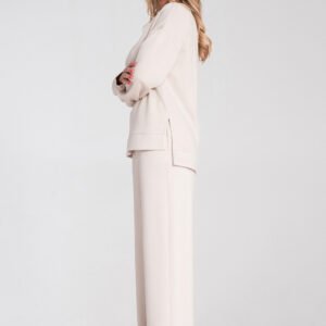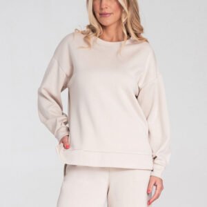 Bluza damska o prostym kroju, wykonana z miękkiej i przyjemnej w dotyku tkaniny. Model z lekko wydłużonym tyłem i krótszym przodem, który subtelnie podkreśla sylwetkę i zapewnia komfort noszenia. Posiada długie rękawy, klasyczny okrągły dekolt oraz dekoracyjne cięcia po bokach, dodające całości nowoczesnego charakteru. Bluza wykończona jest elastycznym ściągaczem w pasie oraz przy mankietach, co gwarantuje dobre dopasowanie i wygodę na co dzień.