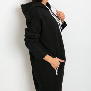 Bluza damska o przedłużonym kroju, z długim rękawem oraz kapturem. Bluza zapinana na zamek, po bokach kieszenie wsuwane również zapinane na zamki.