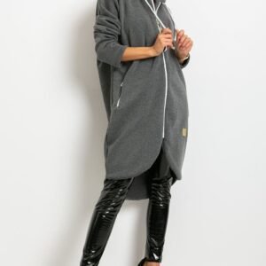 Bluza damska o przedłużonym kroju, z długim rękawem oraz kapturem. Bluza zapinana na zamek, po bokach kieszenie wsuwane również zapinane na zamki.