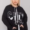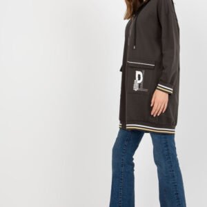 Bluza damska o przedłużonym kroju z długim rękawem oraz kapturem. Bluza zapinana na zamek, na przodzie duże kieszenie wsuwane.