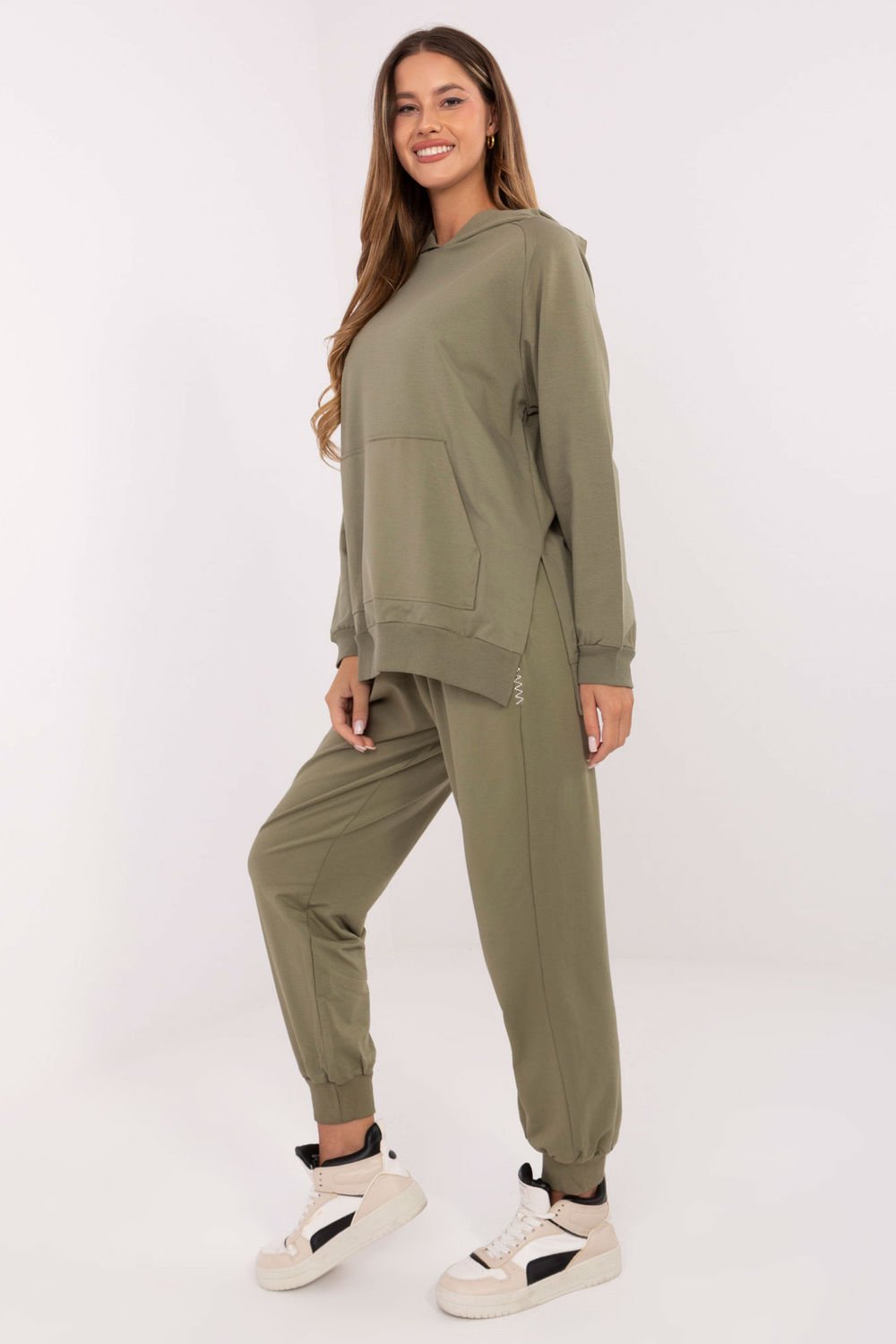 Bluza damska oversize w stylu casual, doskonała na codzienne okazje. Uszyta z bawełny z dodatkiem elastanu, jest miękka, wygodna i przyjemna w noszeniu. Gładki wzór sprawia, że łatwo dopasujesz ją do różnych stylizacji. Model o standardowej długości z kapturem i długim rękawem. Na przodzie znajduje się praktyczna kieszonka typu kangurek, a rozcięcia po bokach nadają bluzie lekkości i modnego charakteru. To idealny wybór dla kobiet, które cenią wygodę połączoną z nowoczesnym stylem.