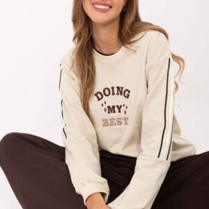 Bluza damska oversize to stylowa propozycja dla kobiet, które cenią sobie komfort i modny, miejski wygląd. Wykonana z miękkiej mieszanki bawełny i poliestru, jest przyjemna w dotyku, trwała i idealna do codziennego noszenia. Luźny krój oversize zapewnia swobodę ruchów i nowoczesny charakter. Model wyróżnia się haftowanymi napisami na przodzie, które dodają mu oryginalności, oraz naszytymi lampasami na rękawach, nadającymi sportowego wyrazu. Bluza ma okrągły dekolt, długie rękawy i standardową długość, co sprawia, że świetnie komponuje się zarówno z jeansami, jak i legginsami. Brak zapięcia podkreśla jej casualowy styl i wygodę użytkowania.