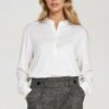 Prosta, elegancka bluzka o regularnym kroju, która stanowi doskonałą bazę do wielu stylizacji. Wykonana z przyjemnego w dotyku materiału wiskozowego, zapewnia komfort przez cały dzień. Dekolt w łódkę delikatnie podkreśla linię szyi, a krótki rękaw wykończony lamówką dodaje całości subtelnej elegancji. Model wkładany przez głowę, idealny do codziennych, casualowych outfitów, ale także świetnie komponujący się z bardziej formalnymi elementami garderoby.