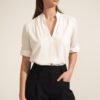 Lekka i elegancka bluzka o regularnym kroju, wykonana z przyjemnego wiskozowego materiału. Dekolt w kształcie litery V subtelnie podkreśla szyję, dodając całości kobiecego charakteru. Bezrękawowy fason zapewnia swobodę i komfort noszenia, a wykończenie dekoltu oraz ramion delikatną pliską nadaje bluzce stylowego wyrazu. Model wkładany przez głowę, doskonały zarówno do codziennych, jak i bardziej eleganckich stylizacji.
