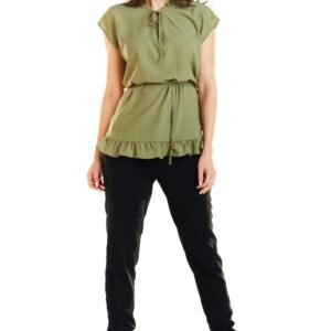 Bluzka z krótkim rękawem, regulowana w pasie i przy dekolcie poprzez sznureczki. Wykonana z miękkiej i delikatnej tkaniny, zapewni niesamowity komfort noszenia i wygodę. Świetnie sprawdzi się do ołówkowej spódnicy, dżinsów lub szerokich spodni. Subtelne falbanki nadają całości lekko zmysłowego charakteru. Produkt wyprodukowany w Polsce.