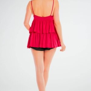 Luźna bluzka z wiskozy na cienkich ramiączkach. Model odkrywający znaczną część pleców i pięknie podkreślający dekolt. Od linii pod biustem rozkloszowana dwiema falbanami. Produkt wyprodukowany w Polsce.