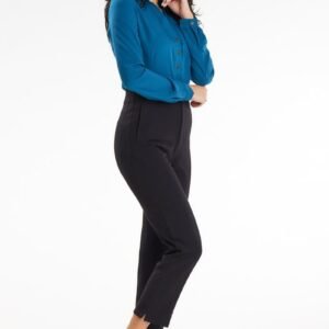 Bluzka na stójce z długim rękawem oraz dekoltem w serek. Rękawy zakończone mankietami zapinanymi na guziki. Bluzka dopasowana i ozdobiona plisą z guzikami. Jest to propozycja do biura jak i do stylizacji mniej formalnych.