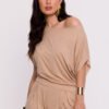 Bluzka uszyta z gładkiej dzianiny dresowej o gramaturze 260 g ze spodem w pętelkę, łącząca komfort noszenia z eleganckim wyglądem. Model bez kieszeni i podszewki, zapinany z tyłu na kryty zamek, co zapewnia wygodę i estetyczne wykończenie. Klasyczny okrągły dekolt pod szyję nadaje bluzce uniwersalny charakter, a rękawy o długości do łokcia w prostym kroju czynią ją idealną na różne okazje. Baskinka subtelnie rozszerzana ku dołowi dodaje kobiecego uroku, podkreślając talię i modelując sylwetkę. Fason lekko taliowany, z dopasowaną górą i delikatnie rozkloszowanym dołem, sprawia, że bluzka pięknie prezentuje się zarówno w eleganckich, jak i codziennych stylizacjach. Długość do bioder czyni ją wygodną i łatwą do zestawienia z różnymi elementami garderoby. Zaprojektowana i uszyta w Polsce z dzianiny wyprodukowanej w Łodzi, gwarancja jakości i dbałości o każdy detal.