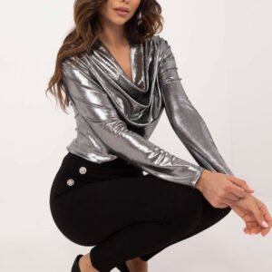 Elegancka bluzka o wyrafinowanym charakterze, idealna na wizytowe okazje oraz imprezy. Wykonana z błyszczącego materiału będącego mieszanką poliestru i wiskozy, który przyciąga wzrok i dodaje stylizacji blasku. Bluzka ma urozmaiconą fakturę materiału, co nadaje jej wyjątkowego wyglądu. Posiada długi rękaw oraz lejący dekolt, który pięknie układa się na sylwetce, dodając całości lekkości i elegancji. Ozdobne marszczenia na materiale wprowadzają dodatkowy element szyku, podkreślając jej oryginalny design. Standardowa długość sprawia, że bluzka doskonale komponuje się z różnymi stylizacjami.