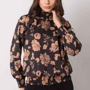 Czarno-camelowa bluzka w kwiaty z długim rękawem.