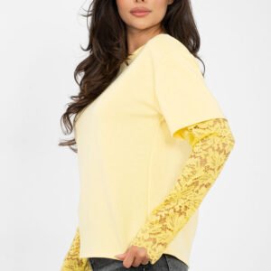 Codzienna damska bluzka o casualowym charakterze łączy prostotę z delikatnym, kobiecym akcentem. Wykonana z wysokiej jakości mieszanki bawełny oraz elastanu jest przyjemna w dotyku, przewiewna i elastyczna, zapewniając komfort noszenia przez cały dzień. Gładki materiał podkreśla uniwersalny styl bluzki, dzięki czemu świetnie sprawdzi się w codziennych stylizacjach. Model ma standardową długość oraz okrągły dekolt, który dodaje klasycznej elegancji. Rękawy w 3/4 wykonane z delikatnej koronki wprowadzają subtelny, efektowny detal, wyróżniając bluzkę spośród klasycznych propozycji. To idealny wybór na co dzień dla kobiet ceniących wygodę połączoną z kobiecym wykończeniem.