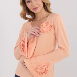 Elegancka bluzka typu longsleeve o dopasowanym kroju, która efektownie podkreśla sylwetkę i łączy klasykę z ozdobnymi detalami. Wykonana z wysokiej jakości bawełny, zapewnia komfort noszenia i przyjemne dopasowanie przez cały dzień. Model o gładkim wzorze posiada dekolt w serek, który subtelnie eksponuje szyję i dodaje kobiecego charakteru. Długie rękawy typu dzwon nadają całości lekkości i elegancji, a ozdobne, materiałowe kwiaty umieszczone na rękawach oraz przy dekolcie stanowią wyjątkowy akcent dekoracyjny. Standardowa długość sprawia, że bluzka doskonale sprawdzi się zarówno w codziennych stylizacjach, do pracy, na spotkania wizytowe, jak i na eleganckie wyjścia czy imprezy.