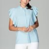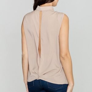 Koszula z delikatnej tkaniny. Klasyczny kołnierzyk, bez rękawów zapinana na błyszczące perełki. Duże nakładane kieszenie na linii biustu. Tył z delikatnym rozcięciem i wiązanym supłem na dole. Szyk w nowoczesnym wydaniu.