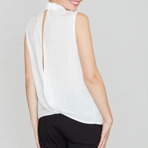 Koszula z delikatnej tkaniny. Klasyczny kołnierzyk, bez rękawów zapinana na błyszczące perełki. Duże nakładane kieszenie na linii biustu. Tył z delikatnym rozcięciem i wiązanym supłem na dole. Szyk w nowoczesnym wydaniu.
