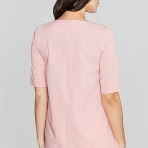 Lekko oversizeowa forma pozwala tuszować niedoskonałości figury. Linia z delikatnie dłuższym tyłem, krótkie rękawy wykończone mankietem. Dekolt okrągły, blisko szyi, zapinana z tyłu na kryty suwak. Z przodu kontrafałdy