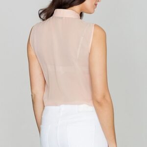 bluzka z delikatnego materiału z klasycznym kołnierzykiem, zapinana na zatrzaski. Model o swobodnym kroju z okrągłym dołem, bez rękawów. Jej przód zdobi nakładany karczek. Doskonale uzupełni zestawy do pracy i nie tylko.