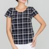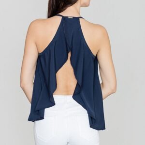 Letnia bluzka o luźnym kroju odsłaniająca plecy, z falbanką z tyłu, na wysokości biustu marszczenia.