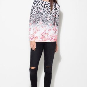 Kolorowa bluzka wykonana z wysokiej jakości dzianiny, idealnie pasuje do codziennych stylizacji. Pięknie podkreśla kobiecość i uniwersalizm noszenia.