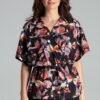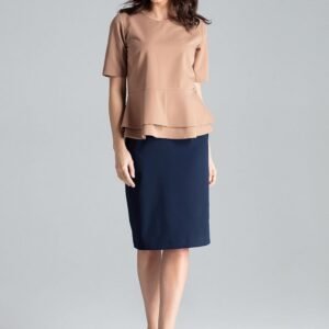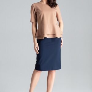 Bluzka z krótkim rękawem, dekolt półokrągły, zapinana z tyłu na kryty zamek. Model z podwójną baskinką świetnie sprawdzi się ze spódnicą do biura czy na miasto ze spodniami.