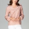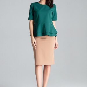 Bluzka z krótkim rękawem, dekolt półokrągły, zapinana z tyłu na kryty zamek. Model z podwójną baskinką świetnie sprawdzi się ze spódnicą do biura czy na miasto ze spodniami.