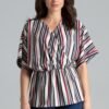 Bluzka z krótkim rękawem, dekolt półokrągły, zapinana z tyłu na kryty zamek. Model z podwójną baskinką świetnie sprawdzi się ze spódnicą do biura czy na miasto ze spodniami.