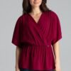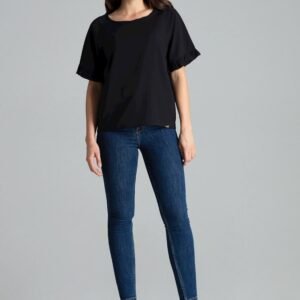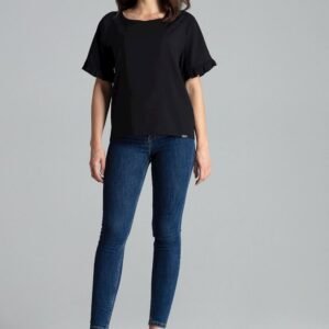 Czarna prosta bluzka z krótkim, reglanowym rękawem zakończonym delikatną falbanką. Półokrągły dekolt. Na dolnym brzegu, z lewej strony metalowy emblemat z logo marki.