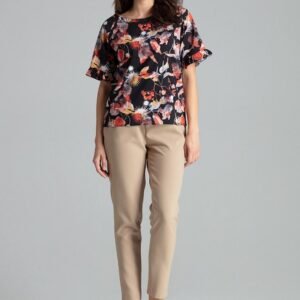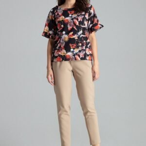 Prosta bluzka w kwiaty z krótkim, reglanowym rękawem zakończonym delikatną falbanką. Półokrągły dekolt. Na dolnym brzegu, z lewej strony metalowy emblemat z logo marki.