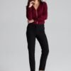 Czarna bluzka z długim bufiastym, kimonowym rękawem z dzianiny w ozdobne poziome paski. Półokrągły dekolt.