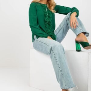 Elegancka bluzka o standardowej długości, wykonana z połączenia poliestru, wiskozy i elastanu, zapewniająca komfort noszenia i nienaganny wygląd przez cały dzień. Gładka tkanina podkreśla wyrafinowany charakter modelu, a pionowa falbanka na przodzie, ozdobiona drobnymi koralikami, dodaje subtelnego blasku i oryginalności. Klasyczny, okrągły dekolt oraz długi rękaw nadają bluzce uniwersalnego, wizytowego charakteru. Brak zapięcia sprawia, że model jest wygodny w zakładaniu. Idealna zarówno do pracy, jak i na eleganckie spotkania.