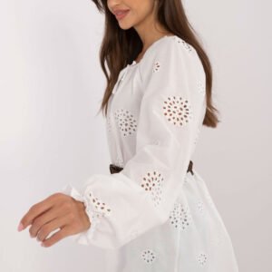 Codzienna bluzka w stylu boho to połączenie wygody i kobiecego uroku. Wykonana z przewiewnej, naturalnej bawełny, idealnie sprawdzi się na co dzień. Model o standardowej długości wyróżnia się ażurowym wzorem, który dodaje lekkości i delikatności. Długi, bufiasty rękaw nadaje bluzce charakterystyczny, swobodny wygląd. Dekolt z ozdobnym wiązaniem podkreśla romantyczny styl boho. To idealna propozycja do jeansów, spódnic czy szortów, świetna zarówno na spacer, jak i na spotkanie z przyjaciółmi. Do kompletu zapinany pasek.