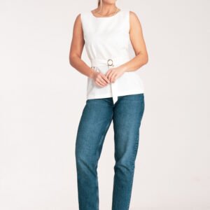 Trapezowa, elegancka bluzka bez zapięcia. Na wysokości biustu dwie skośne zaszewki, dekolt w łódkę, w pasie pasek z materiału z ozdobną złotą klamrą.