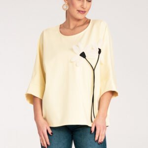 Luźna kimonowa bluzka z rękawem zakończonym szerszym mankietem. Okrągły dekolt. Na piersi ozdoba w formia kwiatu.