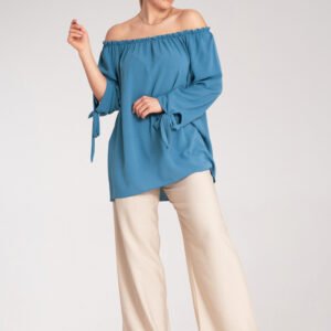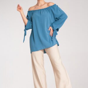 Bluzka w stylu hiszpanki z ozdobnym wiązaniem na rękawach. Model z szerokim, marszczonym dekoltem. Możliwość noszenie z odsłoniętymi ramionami.
