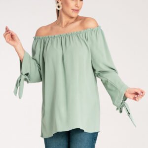 Bluzka w stylu hiszpanki z ozdobnym wiązaniem na rękawach. Model z szerokim, marszczonym dekoltem. Możliwość noszenie z odsłoniętymi ramionami.