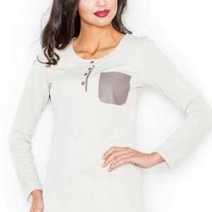 Bluzka z długim rękawem i okrągłym dekoltem. Charakteryzuje się kieszonką w kontrastującym kolorze, wykonaną z eko-skóry, jak również rozpięciem przy dekolcie. Idealna do noszenia na co dzień.