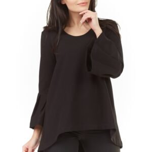 Dzianinowa bluzka z dłuższym tyłem. Bluzka z rękawami zakończonymi falbankami.