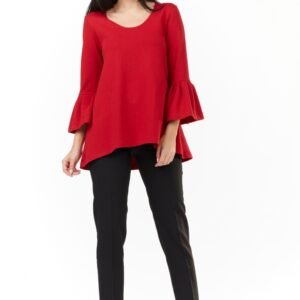 Dzianinowa bluzka z dłuższym tyłem. Bluzka z rękawami zakończonymi falbankami.