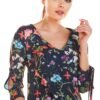 Krótka bluzka z krótkim rękawkiem i efektownym dekoltem hiszpańskim, który subtelnie odsłania ramiona. Wykończona elastycznymi gumkami w talii, rękawach i przy dekolcie, co zapewnia lepsze dopasowanie do sylwetki oraz komfort noszenia. Lekka i kobieca, idealna na letnie dni i wieczorne wyjścia.