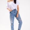 Krótka bluzka z krótkim rękawkiem i efektownym dekoltem hiszpańskim, który subtelnie odsłania ramiona. Wykończona elastycznymi gumkami w talii, rękawach i przy dekolcie, co zapewnia lepsze dopasowanie do sylwetki oraz komfort noszenia. Lekka i kobieca, idealna na letnie dni i wieczorne wyjścia.