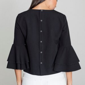 Wygodna bluzka wykonana z delikatnego materiału z ozdobnymi guzikami na plecach oraz falbanką przy rękawach. Krótki przód dodaje seksapilu.