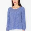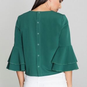 Wygodna bluzka wykonana z delikatnego materiału z ozdobnymi guzikami na plecach oraz falbanką przy rękawach. Krótki przód dodaje seksapilu.