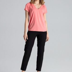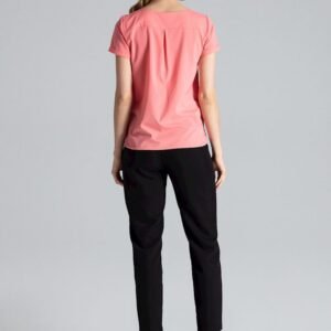 Bluzka z krótkim rękawem z dekoltem w serek. Na wysokości ramion przeszycia z ozdobnymi marszczeniami. Rękaw zakończony wywijanym mankietem. Boki z minimalnym rozcięciem u dołu, wykończona półokrągłym przeszyciem.