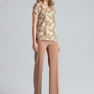 Bluzka z krótkim rękawem z dekoltem w serek. Na wysokości ramion przeszycia z ozdobnymi marszczeniami. Rękaw zakończony wywijanym mankietem. Boki z minimalnym rozcięciem u dołu, wykończona półokrągłym przeszyciem.