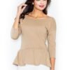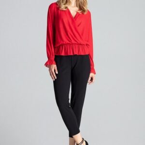Czerwona brokatowa lekko prześwitująca bluzka z kopertowym dekoltem, z długim rękawem. W pasie oraz w rękawach wszyta gumka.