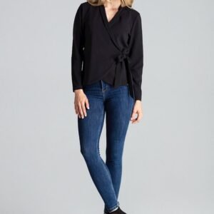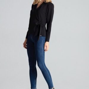 Czarna luźna bluzka z długim rękawem ala żakiet, wiązana w pasie. Bez podszewki. W ramionach wszyte poduszki.
